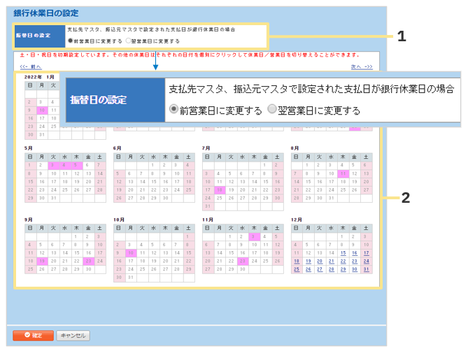 - 「管理」タブ > 「銀行休業日の設定」メニューの画面と機能を説明します。