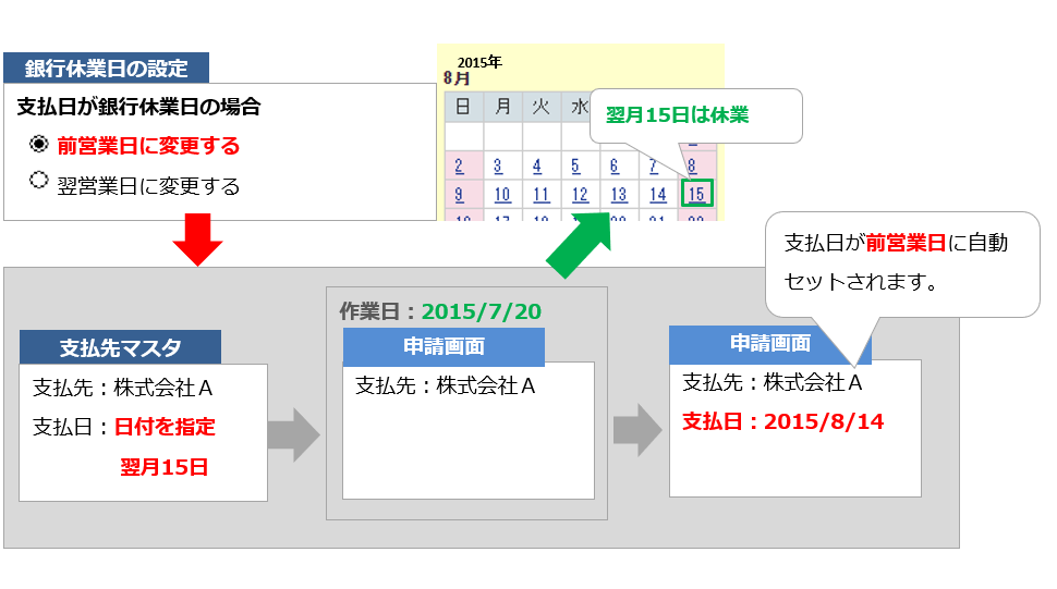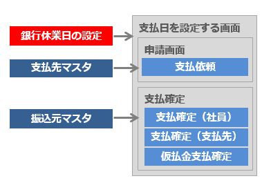 - 「支払先マスタ」「振込元マスタ」で設定した「支払(予定)日」が銀行の休業日に
