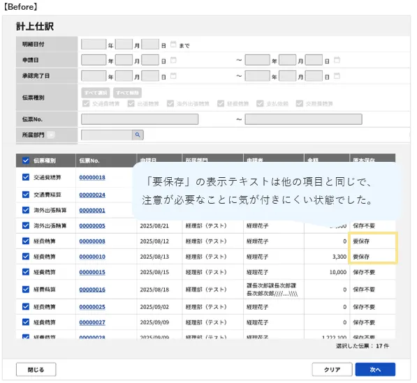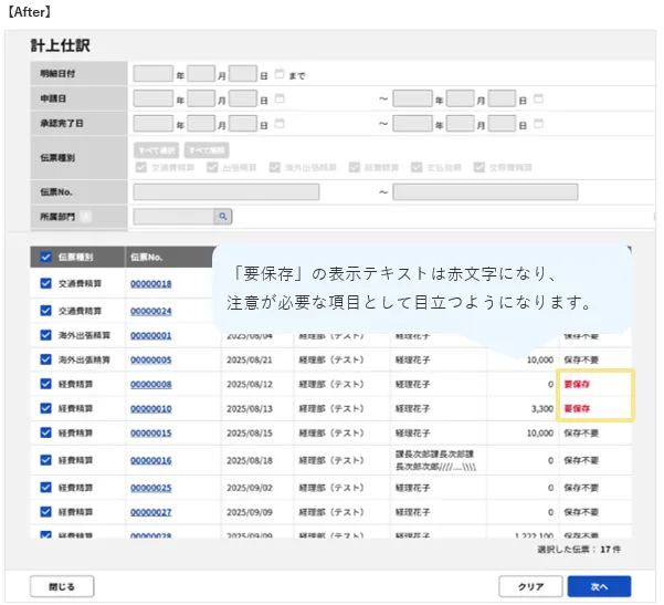計上仕訳/支払確定にて、原本保存が「要保存」である場合のテキストカラーを変更