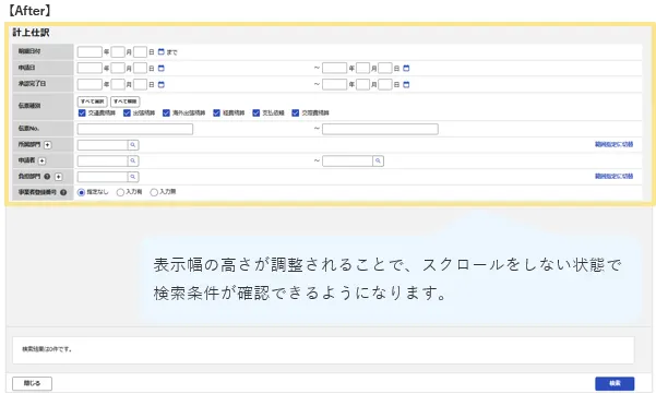 計上仕訳/振替仕訳にて、検索画面が狭く入力や操作がしづらいため、画面の高さを調整します。