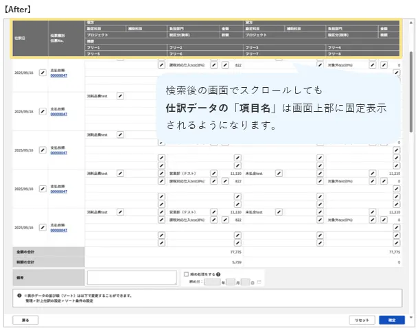 各仕訳の検索結果画面の項目名を固定表示に改善