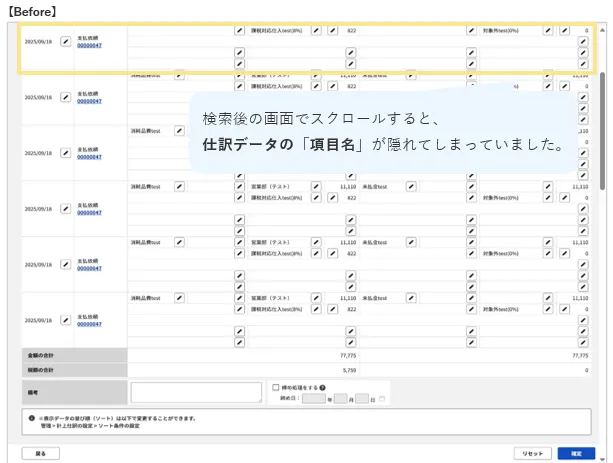 計上仕訳/支払仕訳/振替仕訳の検索結果画面にて、スクロールした際に仕訳データの「項目名」が