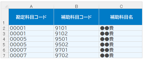 | 勘定科目コード | 最大半角15文字、半角英数字記号のみ 「勘定科目マスタ」にすでに登録済みの 勘定科目コードを登録してください。 勘定科目コードに補助科目コードが紐づきます。 ※1つの勘定科目に対して 複数の補助科目を紐づけ可能です。 |