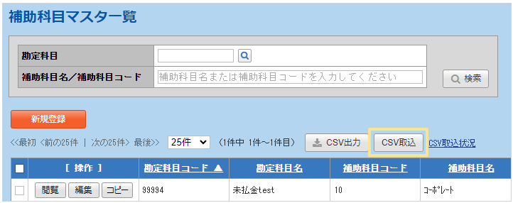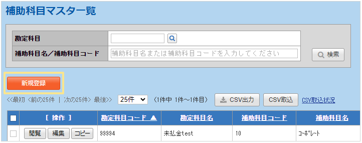 2. 「補助科目マスタ」画面左上の「新規登録」をクリック