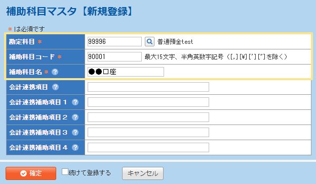 | 補助科目コード | 最大半角15文字、半角英数字記号のみ 会計ソフトで利用しているコードを登録します。 登録すると、後から修正できません。 ※正しいコードで再度マスタを新規登録し直す ことはできます。 |