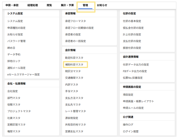- 「楽楽精算」では、会計情報を勘定科目と補助科目の2段階で登録が可能ですが、