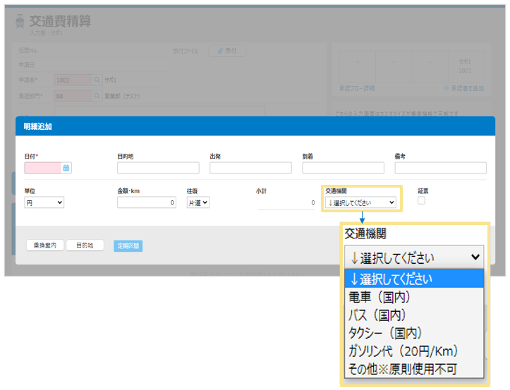 ※計上仕訳(「計上仕訳しない」設定の場合は支払仕訳)の借方の情報です。 - 登録した情報は、以下の申請画面の「交通機関」の選択肢として表示されます。