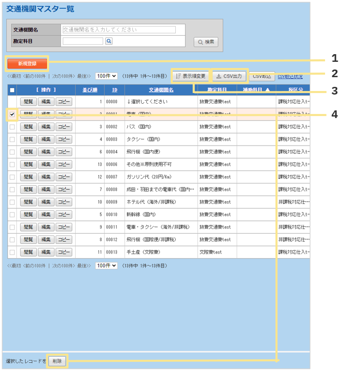 3. 勘定科目(必須項目) 内容 :この交通機関に紐づける勘定科目コードを設定します。 文字数上限:15文字(半角) 備考 : 「勘定科目マスタ」に登録されているコードを設定してください。 |