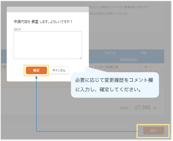 6.必要に応じて変更履歴をコメントに入力し「確定」をクリック