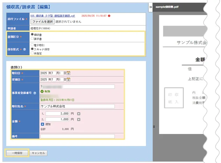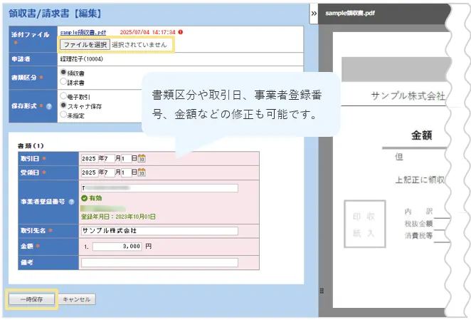 ※取引日や事業者登録番号、金額など情報の修正も可能です。