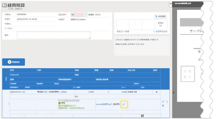 「書類」の追加・削除が必要な場合は、申請者にて修正が必要です。 - 明細など、領収書/請求書以外の伝票の内容を修正したい場合は、