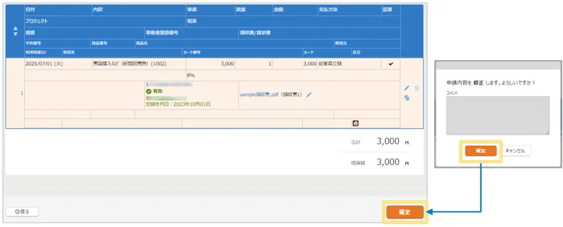 4.伝票画面の「確定」をクリックし、必要に応じてコメントを入力し「確定」をクリック