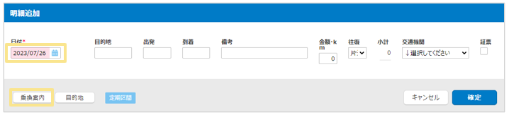 3. 明細の「日付」を入力(カレンダーから選択)し、「乗換案内」をクリック