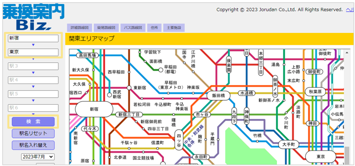 4. 乗換案内が起動するので、経路を入力して「検索」をクリック