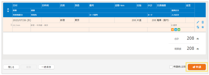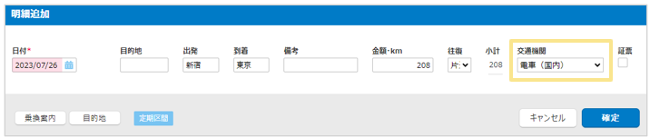 6. 明細の「出発」「到着」「金額」に乗換案内の情報が取り込まれることを確認