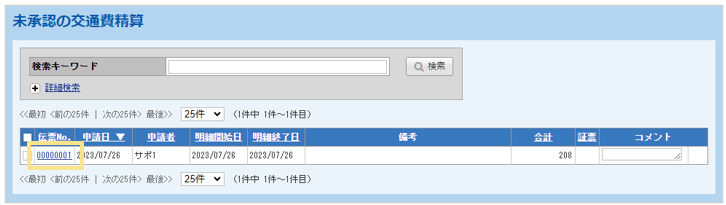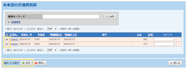 「未承認の交通費精算」画面で、承認したい伝票データにチェックを付けて