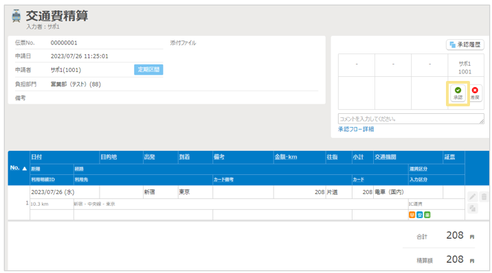※テストのため、この場では自分で申請した伝票データを自分で承認します。