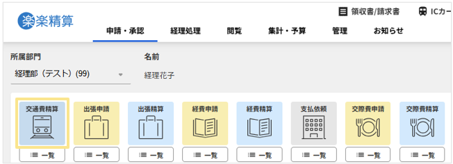 1. 「申請・承認」タブの「交通費精算」をクリック
