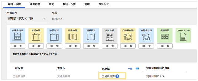 1. 「申請・承認」タブの「未承認」枠内の「交通費精算」をクリック