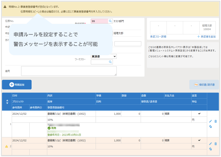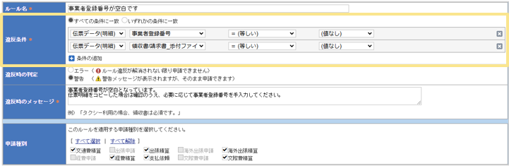 以下のような違反条件の申請ルールを設定することで、警告メッセージを表示させ、