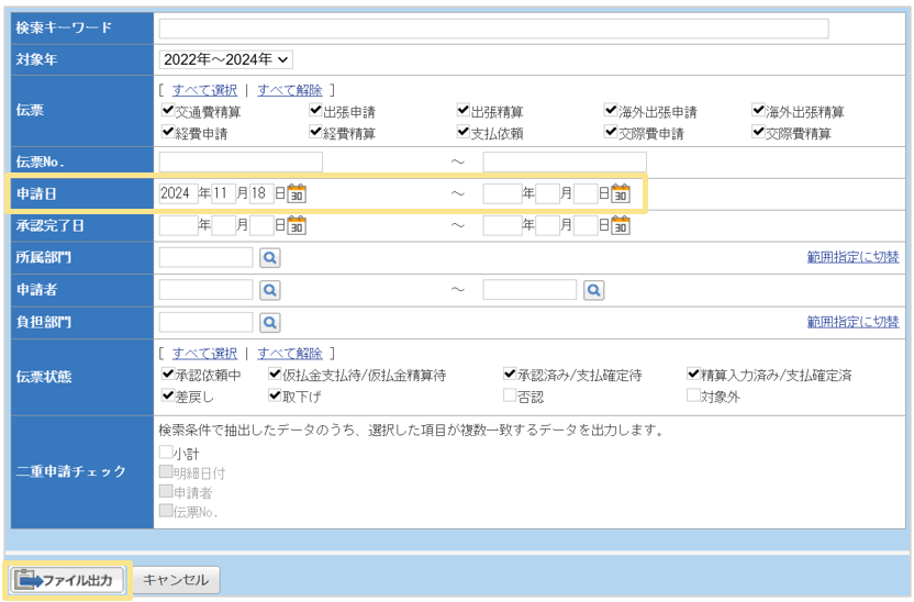 1.「申請・承認」タブ >「伝票データ出力(全部門)」をクリック