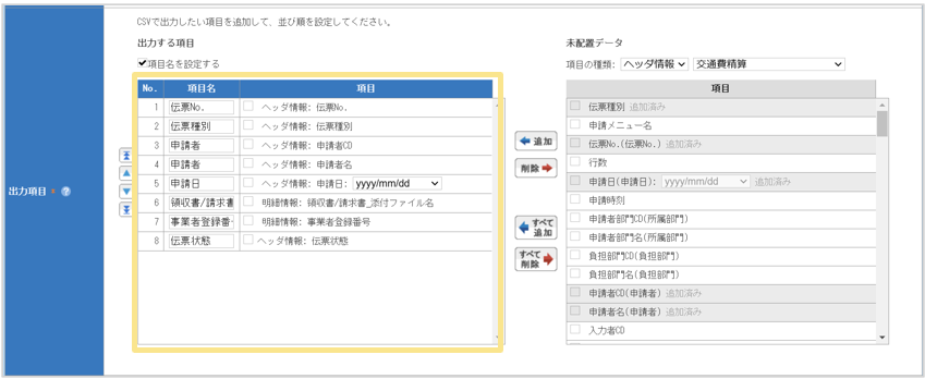4.「出力項目」で必要な項目を「未配置データ」から「出力する項目」に追加