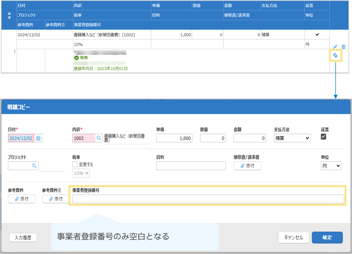 伝票明細をコピーした場合は確認のうえ、必要に応じて事業者登録番号を手入力してください。