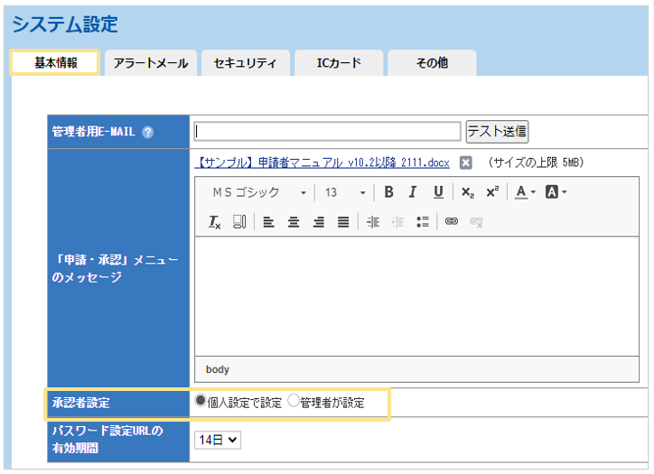 - 「基本情報」タブの「承認者設定」にて、「管理者が設定」もしくは「個人設定で設定」の