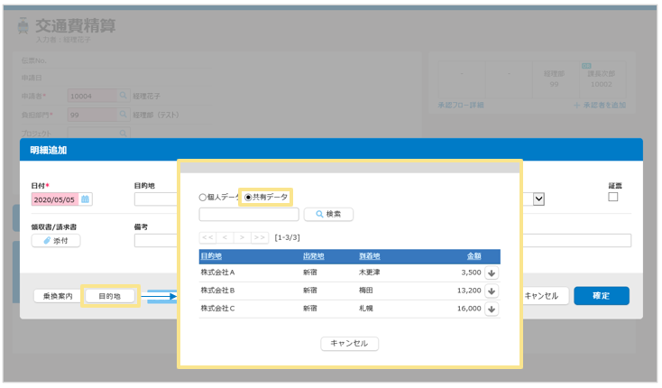 個人データ:ログインユーザーが過去に作成した明細の 目的地/出発地/到着地/金額