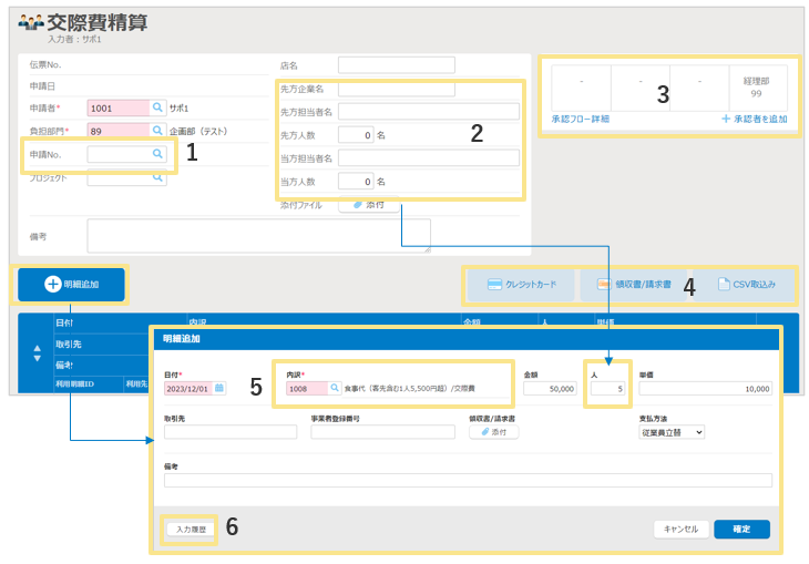 - 事前に「交際費申請」を行っている場合は、その伝票と紐付けて精算を行います。