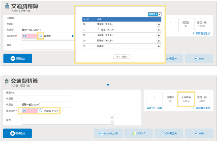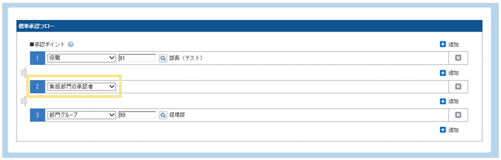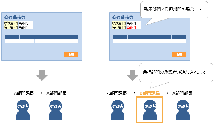 申請者の所属部門と伝票の負担部門が異なる場合に、負担部門の承認者を自動的に追加します。