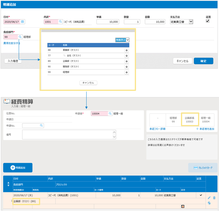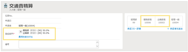 「負担部門」項目が非表示の場合は、負担部門は初期値(ユーザーの所属部門)となっています。 - 承認フローマスタの設定が必要です。「簡易設定」では対応していません。