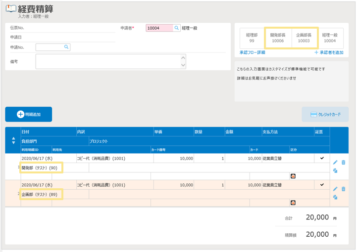 ※明細の「負担部門の承認者」が、自動的に承認フローに追加されます。
