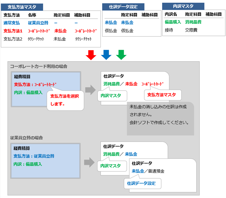 費用計上時の相手科目は「支払方法マスタ」へ登録する「支払方法」ごとに設定できます。