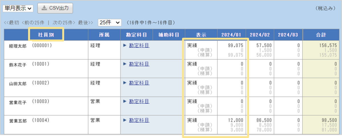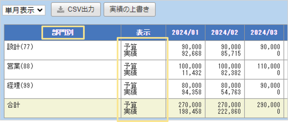 - 実績には最終承認が完了した伝票の金額が反映されます。