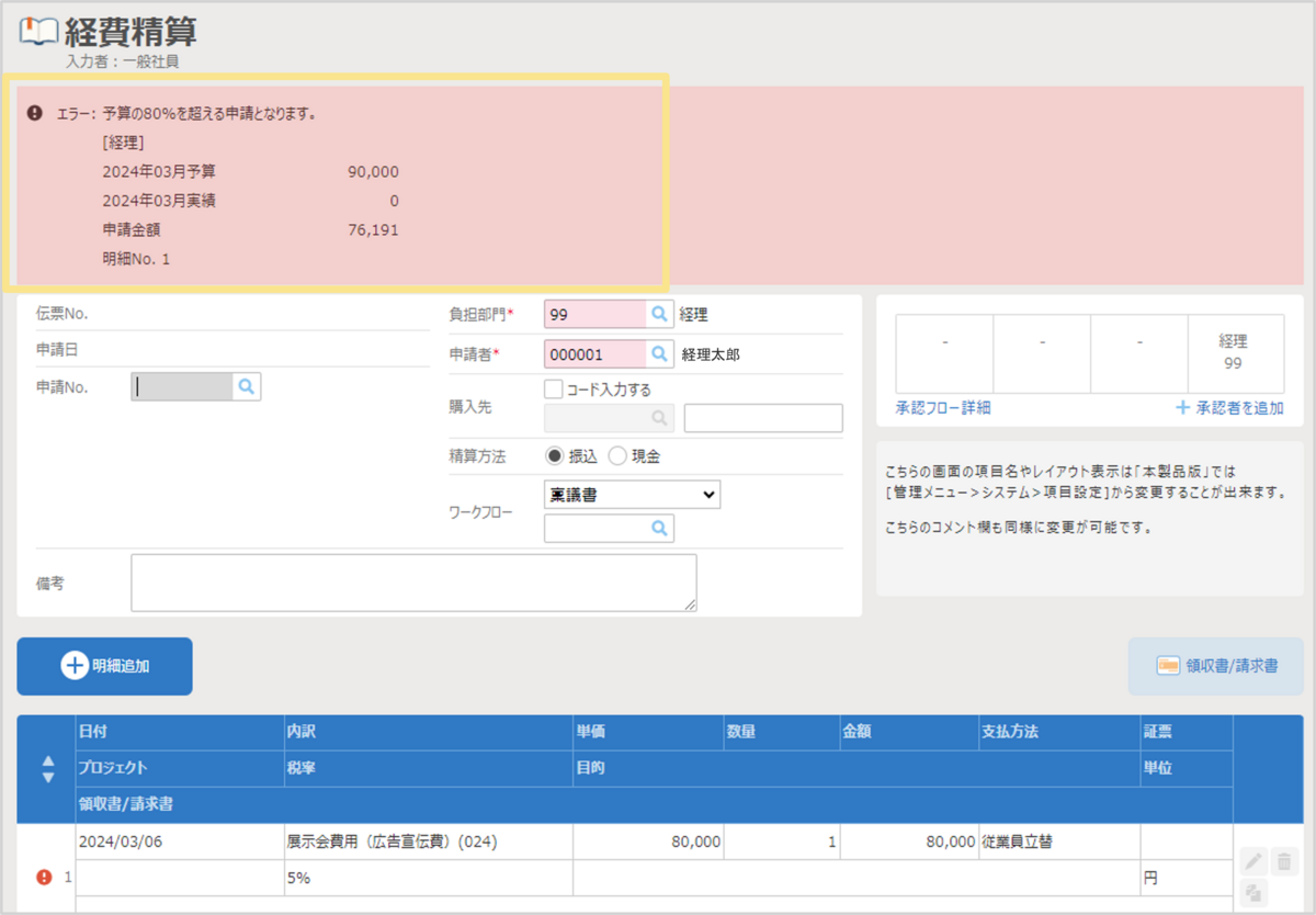 ▶経費予算が超過する前に、警告やエラーの表示が可能