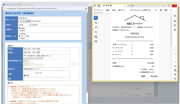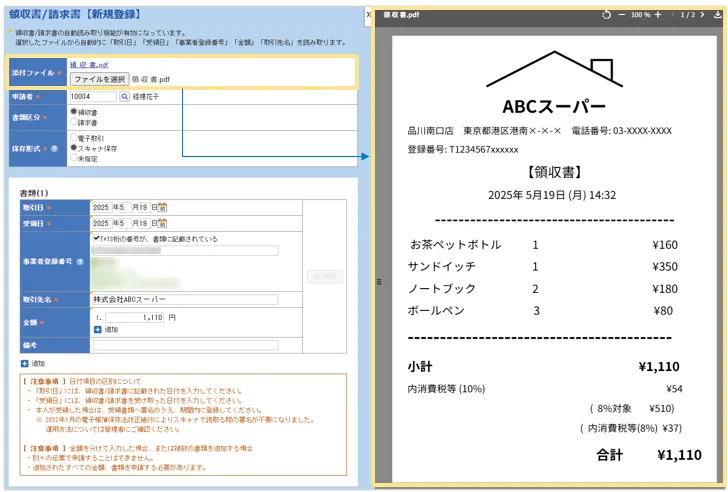 今後は、領収書/請求書の新規登録時に、添付されたPDFファイルを「領収書/請求書【新規登録】」画面内でプレビュー表示できるようになります。