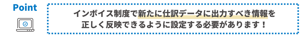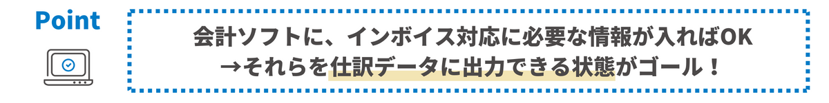 『「インボイス関連の必要な情報が全て入った仕訳データ」を出力できる状態にすること』が設定のゴールとなります。