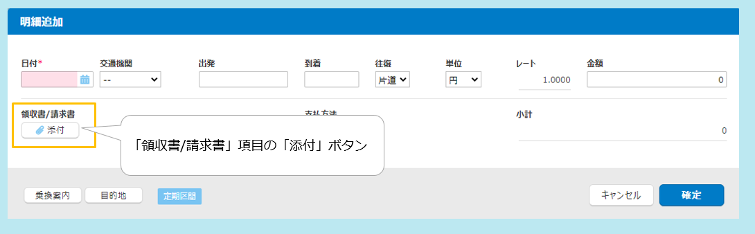 2. 「日付」項目に日付を入力し、「領収書/請求書」項目の「添付」ボタンから領収書/請求書を添付