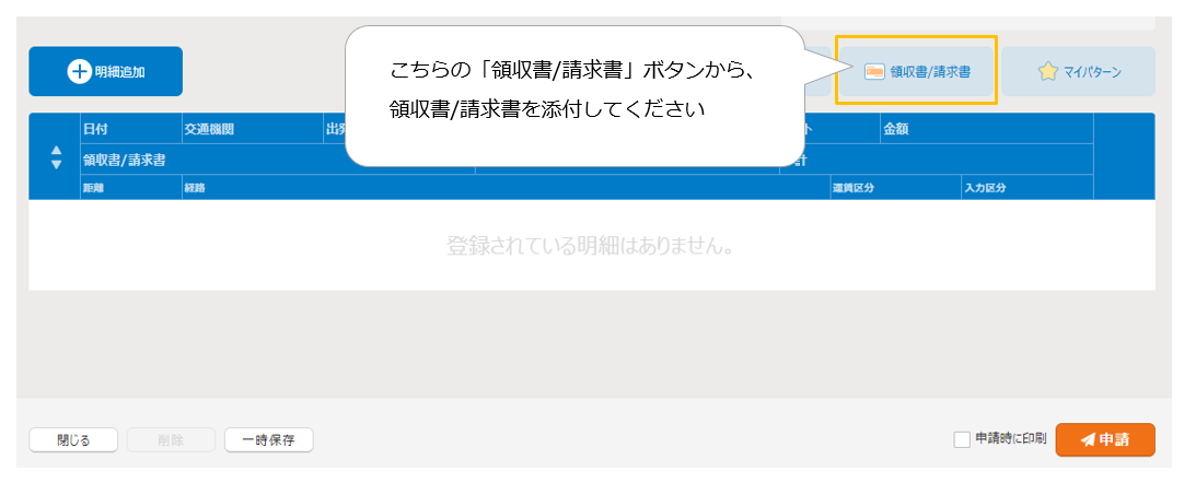 申請画面のヘッダにある「領収書/請求書」ボタンから領収書/請求書の添付および明細を作成ください。