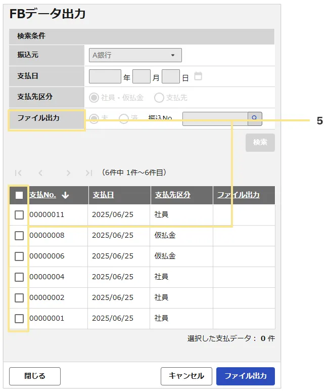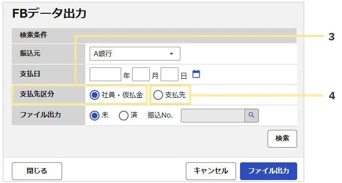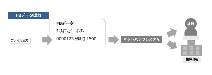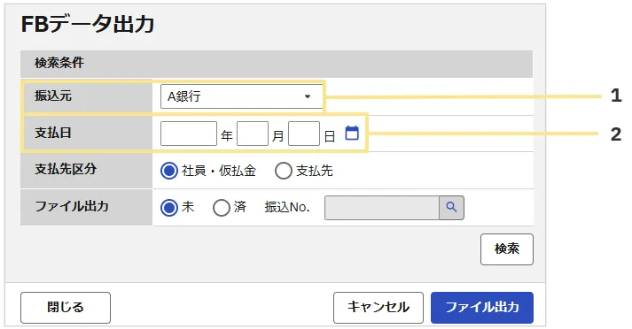 - 「経理処理」タブ >「FBデータ出力」メニューの画面と機能を説明します。