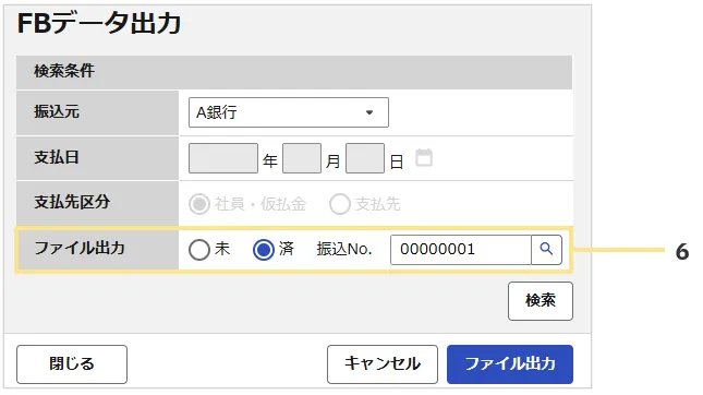 FBデータ出力時に採番される「振込No.」を指定して検索をかける必要があります。