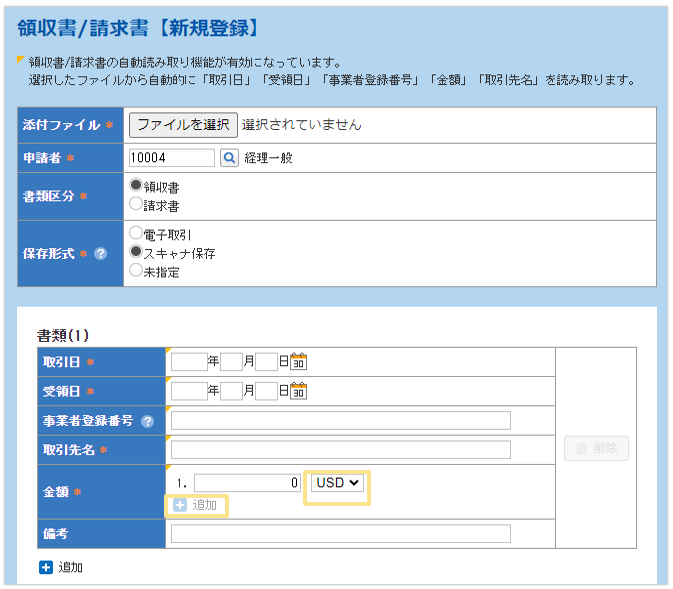 ※外貨の場合は複数明細に分けての登録はできません。(「+追加」ボタンが選択できません。)