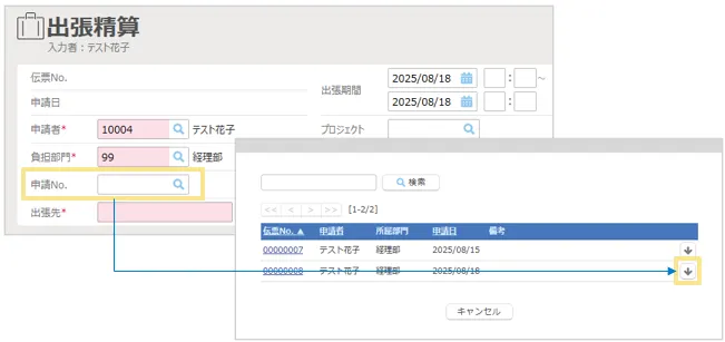 精算伝票に紐づけたい事前申請伝票を選択(↓マークをクリック)
