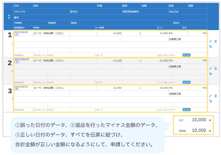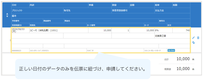- 正しい日付のデータのみを伝票に紐づけて申請する。