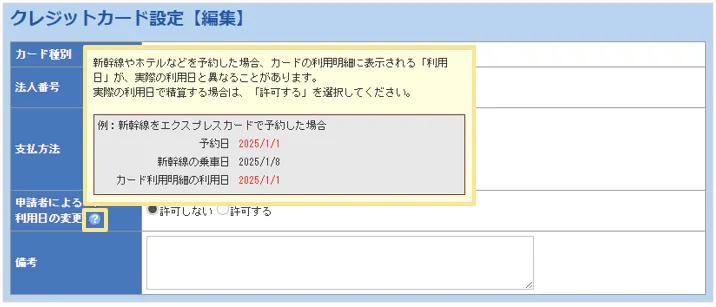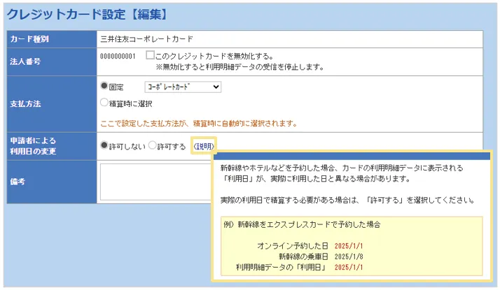 ・クレジットカード設定編集画面(「クレジットカード連携オプション」をご契約のお客様のみ)