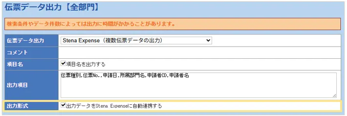 これまでは「楽楽精算」の「伝票データ出力」より、CSVを出力し、「Stena Expense」へ取込