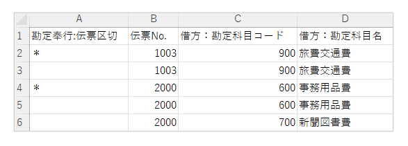 「仕訳データ出力の設定」>「複合仕訳の区切り」で設定した区切りごとに「*」が振られる