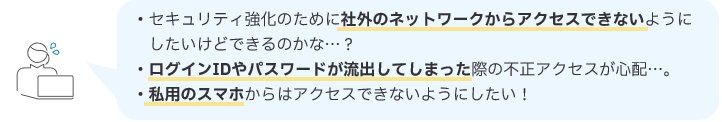 ・ID、PASSが流出しても、特定のIPアドレスからしかアクセスできないように制御可能