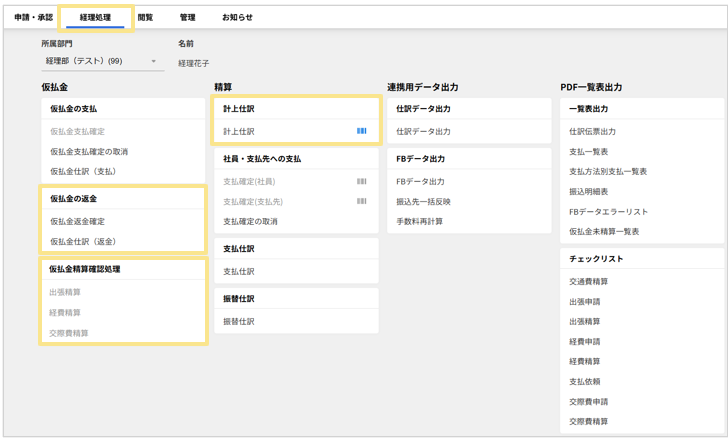 一覧表出力 仕訳伝票出力 支払一覧表 支払方法別支払一覧表 振込明細表 FBデータエラーリスト 仮払金未精算一覧表 チェックリスト (チェックリスト:各申請種別) |